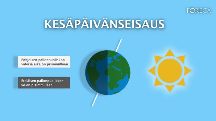 Kesäpäivänseisauksena pohjoinen pallonpuolisko on kallistuneena aurinkoon päin, kun taas eteläinen pallonpuolisko on kallistuneena siitä poispäin. Tästä aiheutuu se, että aurinko pysyy horisontin yläpuolella pohjoisen napapiirin pohjoispuolella yötä päivää.