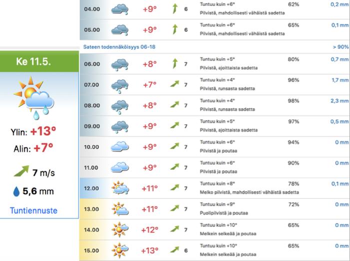 - Tarkista Forecan tuntikohtaisesta 10 vrk:n ennusteesta, mikä on sateen todennäköisyys halutulle ajanjaksolle.