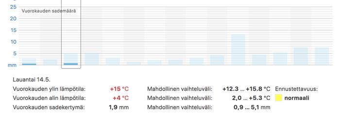 - Tarkista ennusteesta myös sademäärän mahdollinen vaihteluväli. Erityisesti niinä päivinä, kun kyse on kuuroittaisesta sateesta tai vaikeasti ennustettavissa olevasta laaja-alaisesta sadealueesta, sademäärän vaihteluväli on suuri.