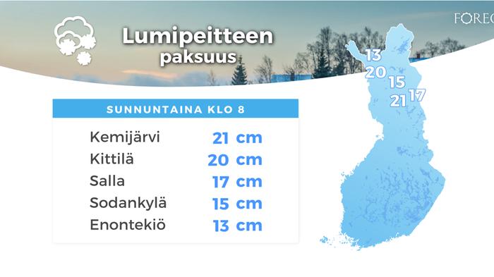 Lauantaina Lappiin saapunut lumisadealue pysyttelee edelleen paikoillaan. Lunta on kertynyt eilisen sekä viime yön kuluessa jopa parisenkymmentä senttiä. Lumisin paikka aamulla klo 8 oli Kemijärvi, missä lumipeitteen paksuus oli 21 cm.