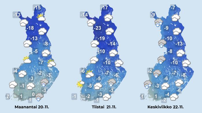 Sää on ollut vuodenaikaan nähden kylmää, eikä tilanne muutu 20. marraskuuta alkavalla viikolla. Viikon alkupäivinä pilvipeite rakoilee edelleen ja tuuli on vielä sisämaassa heikkoa, joten varsinkin Lapissa pakkanen on paikoin jopa kireää.