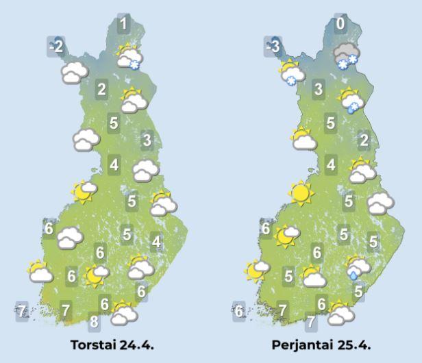 Yöllä paikalliset pakkaslukemat ovat mahdollisia etelässäkin, mutta laajimmin pakkasta on odotettavissa maan keski- ja pohjoisosassa. Yleisimmin pakkasta on muutama aste, mutta Pohjois-Lapissa jopa 15–20 astetta.